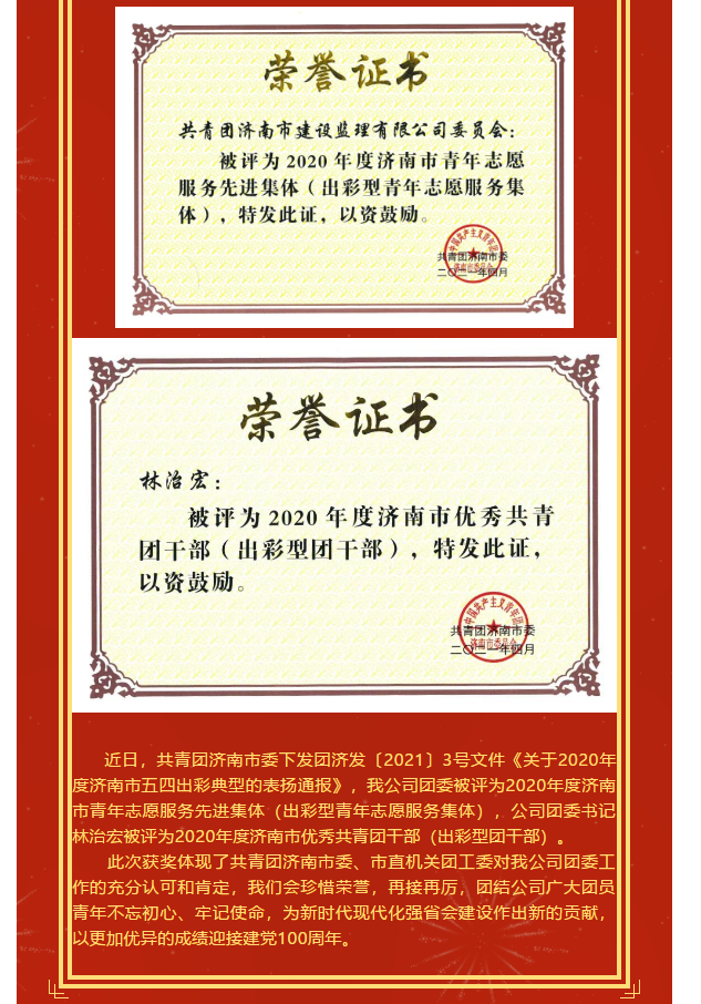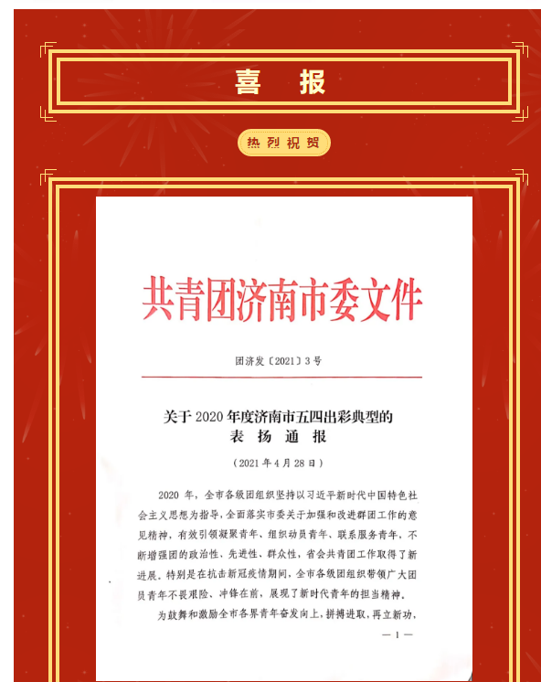 珍惜荣誉 砥砺前行——公司团委在2020年度济南市五四出彩典型评选中荣获两项荣誉
