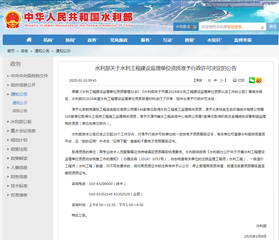 二〇二五年一月,经水利部批准,我公司同时取得水利工程施工监理乙级资质及水土保持工程施工监理乙级资质。这是我公司在取得工程监理综合资质后,又获得的住建部管理范畴之外的从业资格,为公司经营业务开辟新的领域,为公司业务类型的拓展提供新的平台,也为公司持续、快速发展奠定了坚实基础。