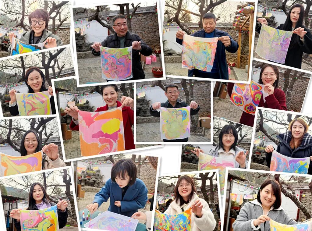 品尝完甜蜜的糖葫芦,大家又纷纷投入到水拓画丝巾活动中。创作、水拓、固色再到晾干,随着一幅幅色彩斑斓的画作拓印于丝巾之上,大家由衷地发出欢呼和赞叹,欣赏着这份独一无二的美,感受非物质文化遗产水拓画的独特魅力。水拓丝巾的制作不仅考验着大家的耐心与细心,更是一次对美的追求与探索。